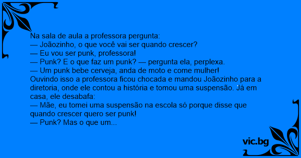 — Mãe, eu tomei uma suspensão na escola só porque disse que quando crescer quero ser punk!