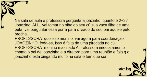 PROFESSORA: menino malcriado A professora imediatamente chama o pai de joaozinho e a diretora para uma reunião e fala q o joaozinho está xingando muito na sala e tem que ser tomada uma providencia.