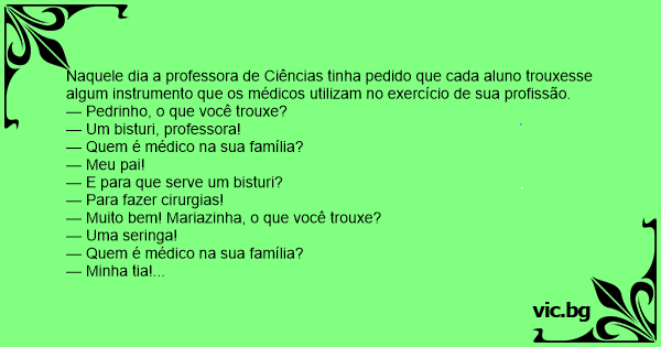 Naquele dia a professora de Ciências tinha pedido que cada aluno trouxesse algum instrumento que os médicos utilizam no exercício de sua profissão.