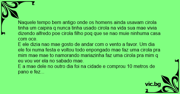 Naquele tempo bem antigo onde os homens ainda usavam cirola tinha um caipira q nunca tinha usado cirola na vida sua mae vivia dizendo alfredo poe cirola filho poq que se nao muie ninhuma casa com oce.