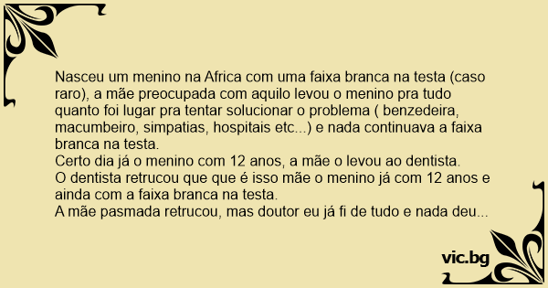 Nasceu um menino na Africa com uma faixa branca na testa (caso raro), a mãe preocupada com aquilo levou o menino pra tudo quanto foi lugar pra tentar solucionar o problema ( benzedeira, macumbeiro, simpatias, hospitais etc...) e nada continuava a faixa branca na testa.