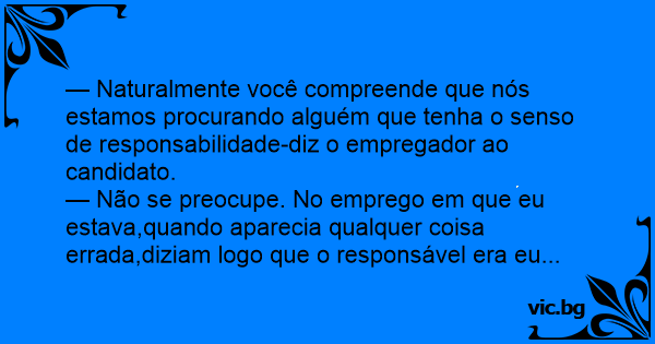 — Não se preocupe. No emprego em que eu estava,quando aparecia qualquer coisa errada,diziam logo que o responsável era eu...