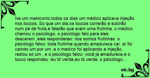 Ne um maniconio,todos os dias um médico aplicava injeção nos loucos. So que um dia,os loucos correrão e subirão num pé de fruta,e falarão que eram uma frutinha. o médico chamou o psicólogo, o psicólogo falo para eles descerem ,eles responderao: nos somos frutinhas. o psicólogo falou: toda frutinha quando amadurece caí. aí foi caindo um por um ,e o medíco foi aplicando a injeção. restou só um , e o psicólogo falou: você já amadurece,e o louco respondeu :eu tó´verde,eu tó verde, o psicólogo pensou deixa este cara. o psicólogo falou com o útimo louco que restou. eu vou ti provar que você já amadoreceu,enfia o dedo no cuzinho e cheira. o louco emfiou o dedo caiu e gritou eu já apodreci eu já apodreciiii!!!!!!