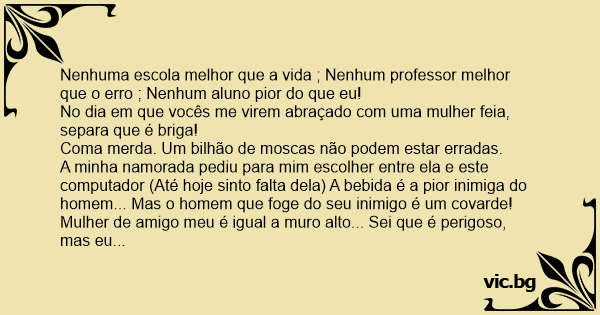Nenhuma escola melhor que a vida ; Nenhum professor melhor que o erro ; Nenhum aluno pior do que eu!
