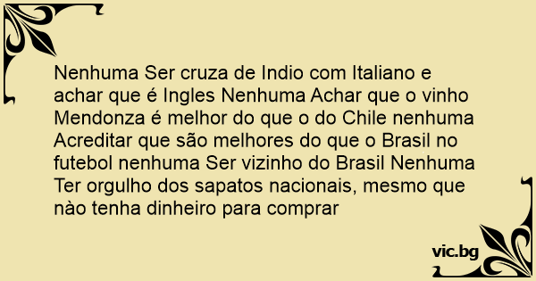 Nenhuma Ser cruza de Indio com Italiano e achar que é Ingles Nenhuma Achar que o vinho Mendonza é melhor do que o do Chile nenhuma Acreditar que são melhores do que o Brasil no futebol nenhuma Ser vizinho do Brasil Nenhuma Ter orgulho dos sapatos nacionais, mesmo que nào tenha dinheiro para comprar