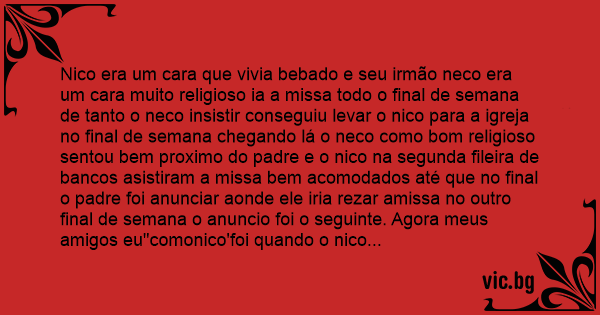 Nico era um cara que vivia bebado e seu irmão neco era um cara muito religioso ia a missa todo o final de semana de tanto o neco insistir conseguiu levar o nico para a igreja no final de semana chegando lá o neco como bom religioso sentou bem proximo do padre e o nico na segunda fileira de bancos asistiram a missa bem acomodados até que no final o padre foi anunciar aonde ele iria rezar amissa no outro final de semana o anuncio foi o seguinte. Agora meus amigos eu"comonico'foi quando o nico bebado levantou revoltado e disse como nico uma ova vá comer o neco que ta mais perto do senhor.