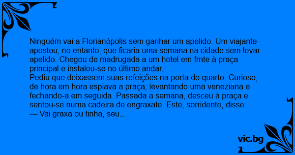 Ninguém vai a Florianópolis sem ganhar um apelido. Um viajante apostou, no entanto, que ficaria uma semana na cidade sem levar apelido. Chegou de madrugada a um hotel em frnte à praça principal e instalou-se no último andar.