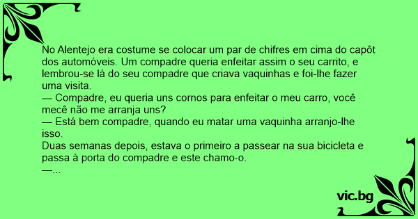 No Alentejo era costume se colocar um par de chifres em cima do capôt dos automóveis. Um compadre queria enfeitar assim o seu carrito, e lembrou-se lá do seu compadre que criava vaquinhas e foi-lhe fazer uma visita.