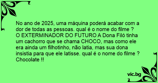 O EXTERMINADOR DO FUTURO A Dona Filó tinha um сасhоrrо que se chama CHOCO, mas como ele era ainda um filhotinho, não latia, mas sua dona insistia para que ele latisse. qual é o nome do filme ?
