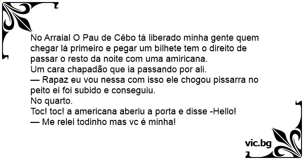 No Arraial O Раu de Cêbo tá liberado minha gente quem chegar lá primeiro e pegar um bilhete tem o direito de passar o resto da noite com uma amiricana.