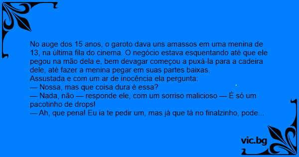 No auge dos 15 anos, o garoto dava uns amassos em uma menina de 13, na última fila do cinema. O negócio estava esquentando até que ele pegou na mão dela e, bem devagar começou a puxá-la para a cadeira dele, até fazer a menina pegar em suas partes baixas.