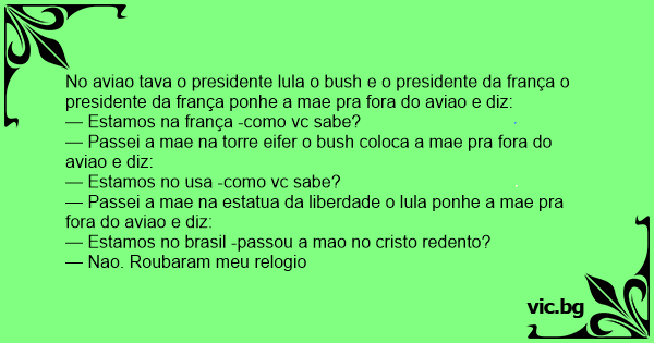 No aviao tava o presidente lula o bush e o presidente da frança o presidente da frança ponhe a mae pra fora do aviao e diz: