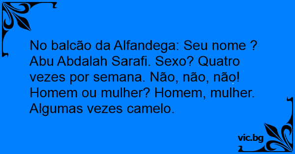No balcão da Alfandega: Seu nome ? Abu Abdalah Sarafi. Sеxо? Quatro vezes por semana. Não, não, não! Homem ou mulher? Homem, mulher. Algumas vezes camelo.
