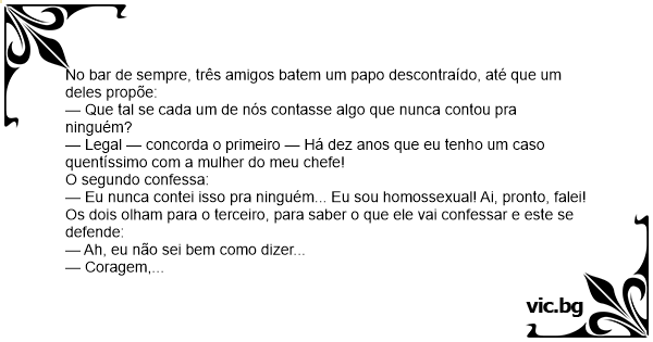 — Legal — concorda o primeiro — Há dez anos que eu tenho um caso quentíssimo com a mulher do meu chefe!
