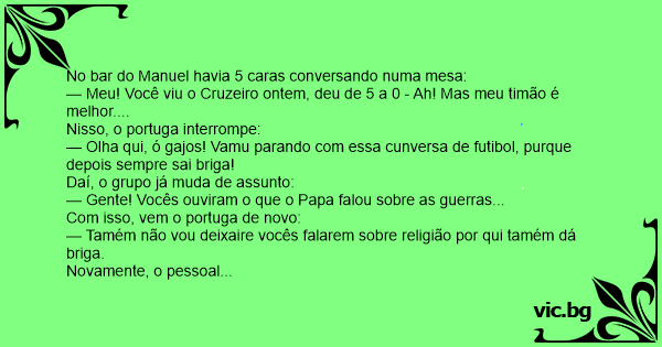 — Olha qui, ó gajos! Vamu parando com essa cunversa de futibol, purque depois sempre sai briga!