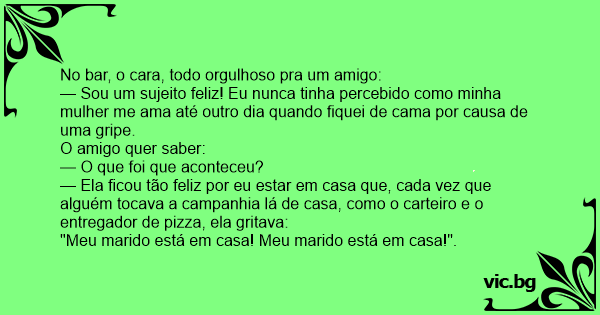 — Sou um sujeito feliz! Eu nunca tinha percebido como minha mulher me ama até outro dia quando fiquei de cama por causa de uma gripe.