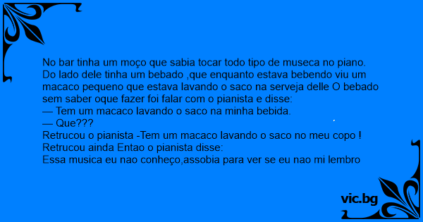 Do lado dele tinha um bebado ,que enquanto estava bebendo viu um macaco pequeno que estava lavando o saco na serveja delle O bebado sem saber oque fazer foi falar com o pianista e disse: