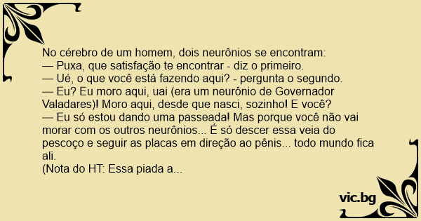 — Eu? Eu moro aqui, uai (era um neurônio de Governador Valadares)! Moro aqui, desde que nasci, sozinho! E você?