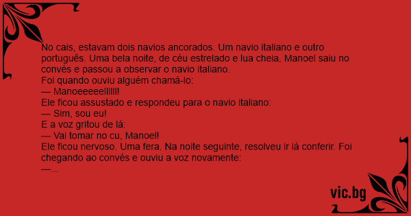 — Faça o seguinte: assim que tu chegares ao convés, grita Giovanni. Está cheio de Giovanni nos navios italianos. Aí, quando ele responder, tu o mandas tomar no cu, no teu lugar.