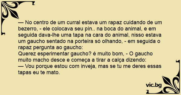 — No centro de um curral estava um rapaz cuidando de um bezerro, - ele colocava seu pin.. na boca do animal, e em seguida dava-lhe uma tapa na cara do animal, nisso estava um gaucho sentado na porteira só olhando, - em seguida o rapaz pergunta ao gaucho: