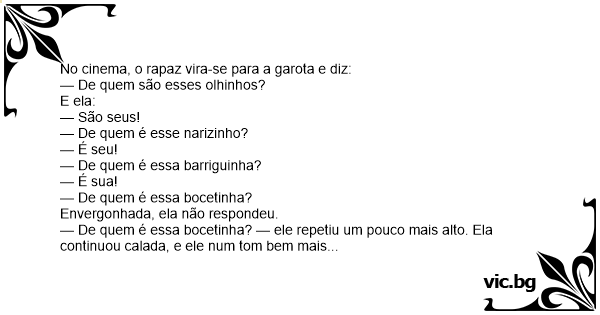 — De quem é essa bocetinha? — ele repetiu um pouco mais alto. Ela continuou calada, e ele num tom bem mais alto: