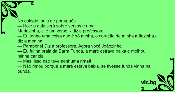 — Não rimou porque a maré estava baixa, se tivesse funda vinha na bunda.