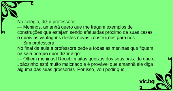 Nisto o Joãozinho levanta a mão. Diz a professora: