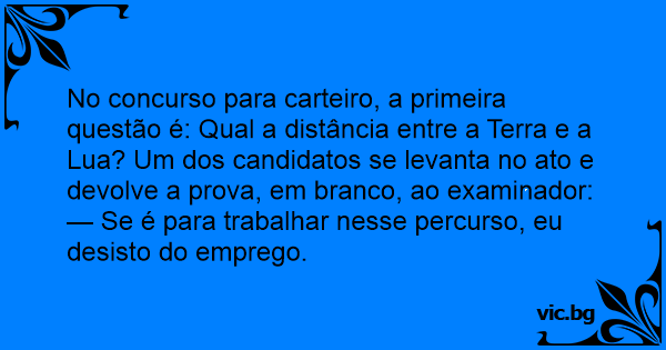 No concurso para carteiro, a primeira questão é: Qual a distância entre a Terra e a Lua? Um dos candidatos se levanta no ato e devolve a prova, em branco, ao examinador: