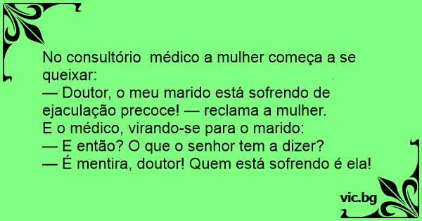 — Doutor, o meu marido está sofrendo de ejaculação precoce! — reclama a mulher.