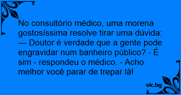 — Doutor é verdade que a gente pode engravidar num banheiro público? - É sim - respondeu o médico. - Acho melhor você parar de тrераr lá!