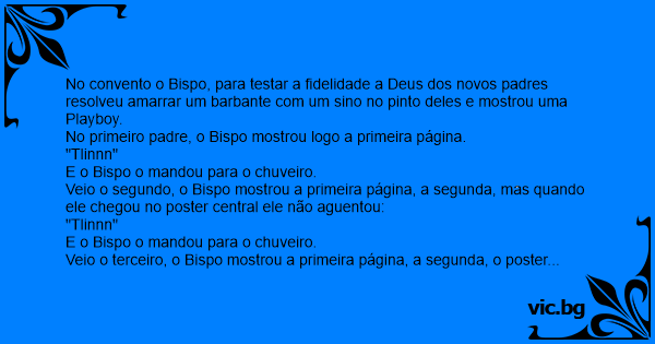 No convento o Bispo, para testar a fidelidade a Deus dos novos padres resolveu amarrar um barbante com um sino no pinto deles e mostrou uma Рlаyвоy.
