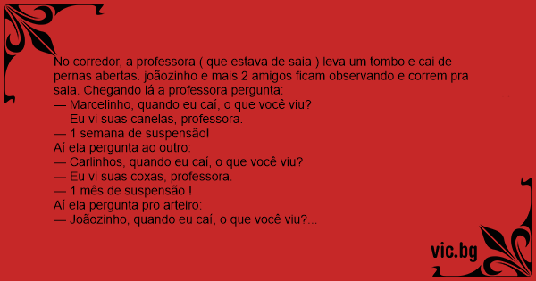 No corredor, a professora ( que estava de saia ) leva um tombo e cai de pernas abertas. joãozinho e mais 2 amigos ficam observando e correm pra sala. Chegando lá a professora pergunta: