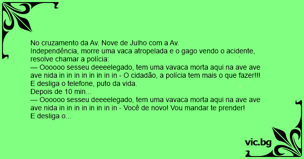 — Oooooo sesseu deeeelegado não des des liga por por por favor, é que tem uma vavaca morta aqui na ave ave avenida nó nó nó nó nó nó nove de julho O delegado vermelho de raiva pergunta: