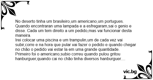 Quando encontraran uma lampada e a esfregaram,sai o genio e disse. Cada um tem direito a um pedido,mas vai funcionar desta maneira.