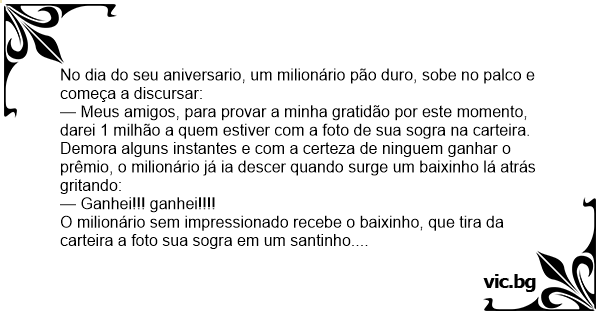 — Meus amigos, para provar a minha gratidão por este momento, darei 1 milhão a quem estiver com a foto de sua sogra na carteira.