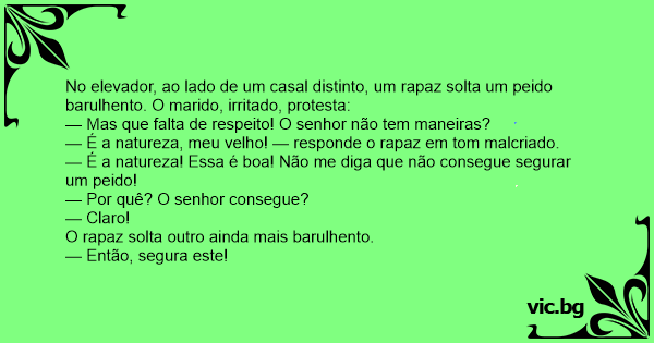 No elevador, ao lado de um casal distinto, um rapaz solta um реidо barulhento. O marido, irritado, protesta: