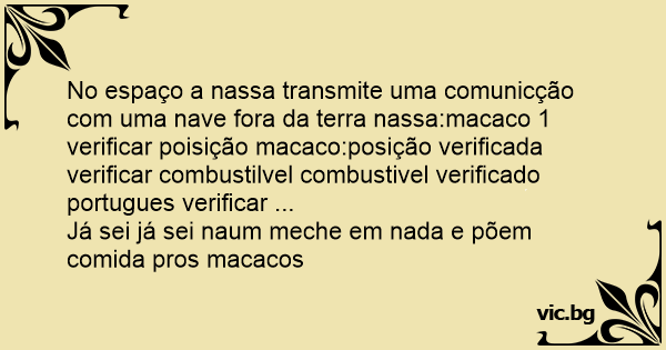 No espaço a nassa transmite uma comunicção com uma nave fora da terra nassa:macaco 1 verificar poisição macaco:posição verificada verificar combustilvel combustivel verificado portugues verificar ...