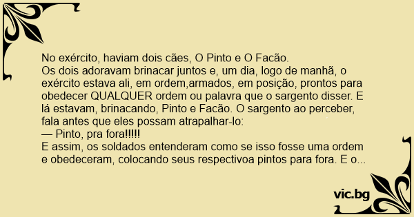 Os dois adoravam brinacar juntos e, um dia, logo de manhã, o exército estava ali, em ordem,armados, em posição, prontos para obedecer QUALQUER ordem ou palavra que o sargento disser. E lá estavam, brinacando, Pinto e Facão. O sargento ao perceber, fala antes que eles possam atrapalhar-lo: