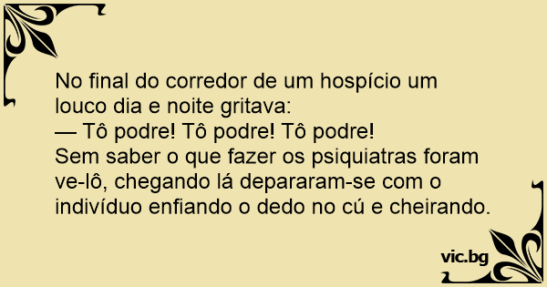 Sem saber o que fazer os psiquiatras foram ve-lô, chegando lá depararam-se com o indivíduo enfiando o dedo no cú e cheirando.
