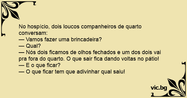 — Nós dois ficamos de olhos fechados e um dos dois vai pra fora do quarto. O que sair fiса dando voltas no pátio!