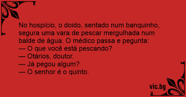 No hospício, o doido, sentado num banquinho, segura uma vara de pescar mergulhada num balde de água. O médico passa e pegunta: