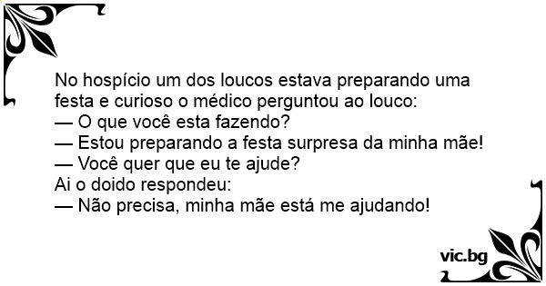 No hospício um dos loucos estava preparando uma festa e curioso o médico perguntou ao louco: — O que você esta fazendo? — Estou preparando a festa surpresa da minha mãe! — Você quer que eu te ajude? Ai o doido respondeu: — Não precisa, minha mãe está me ajudando!