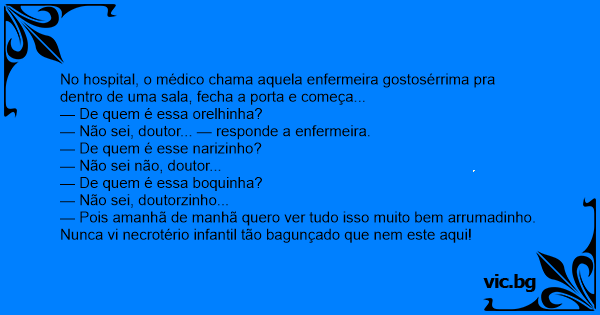No hospital, o médico chama aquela enfermeira gostosérrima pra dentro de uma sala, fecha a porta e começa...
