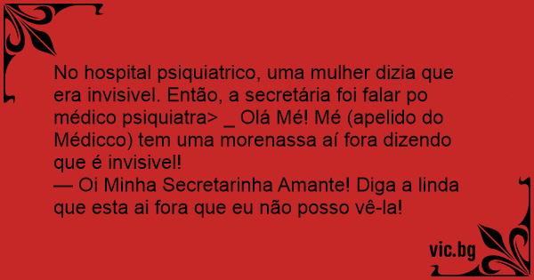 No hospital psiquiatrico, uma mulher dizia que era invisivel. Então, a secretária foi falar po médico psiquiatra> _ Olá Mé! Mé (apelido do Médicco) tem uma morenassa aí fora dizendo que é invisivel!