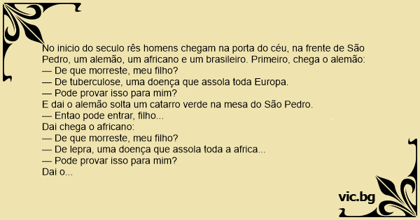No inicio do seculo rês homens chegam na porta do céu, na frente de São Pedro, um alemão, um africano e um brasileiro. Primeiro, chega o alemão: