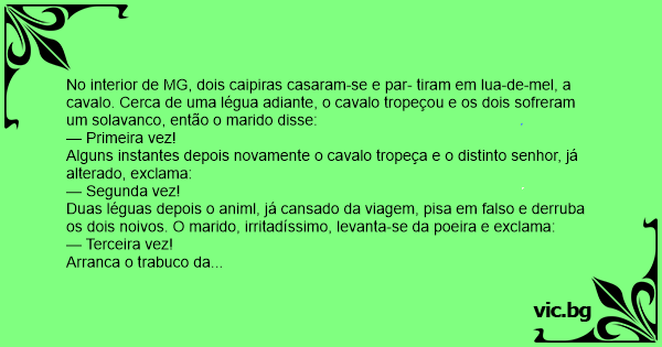 No interior de MG, dois caipiras casaram-se e par- tiram em lua-de-mel, a cavalo. Cerca de uma légua adiante, o cavalo tropeçou e os dois sofreram um solavanco, então o marido disse: