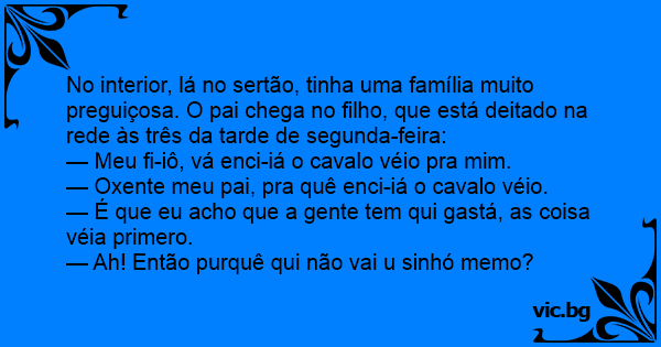 No interior, lá no sertão, tinha uma família muito preguiçosa. O pai chega no filho, que está deitado na rede às três da tarde de segunda-feira: