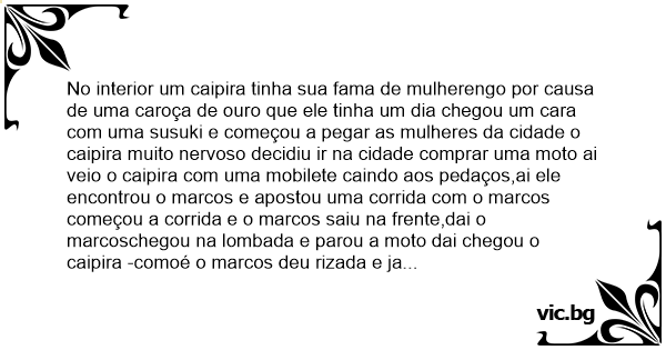No interior um caipira tinha sua fama de mulherengo por causa de uma caroça de ouro que ele tinha um dia chegou um cara com uma susuki e começou a pegar as mulheres da cidade o caipira muito nervoso decidiu ir na cidade comprar uma moto ai veio o caipira com uma mobilete caindo aos pedaços,ai ele encontrou o marcos e apostou uma corrida com o marcos começou a corrida e o marcos saiu na frente,dai o marcoschegou na lombada e parou a moto dai chegou o caipira -comoé o marcos deu rizada e ja passou na frente do caipira chegou outra lombada ele parou a moto ai o caipira -comoé o marcos de risadae passou o caipira de novo dai chegou perto de um precipiçio dai o marcos parou a moto ai ocaipirade novo -comoé e o caipiracaiu lá no precipiçio o marcos tirando um sarro da cara do caipira falando -ai caipira o que aconteceu o caipira -comoé que para essa coisa aqui