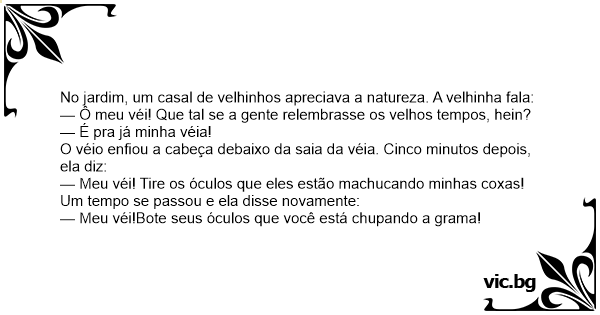 O véio enfiou a cabeça debaixo da saia da véia. Cinco minutos depois, ela diz:
