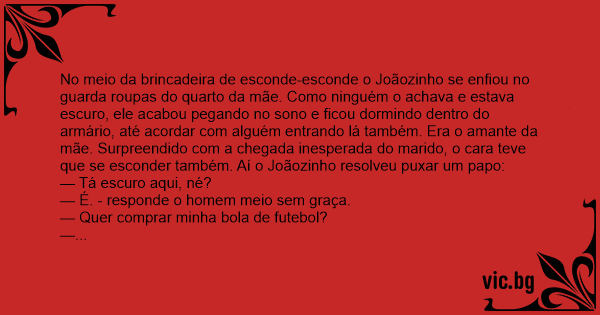 No meio da brincadeira de esconde-esconde o Joãozinho se enfiou no guarda roupas do quarto da mãe. Como ninguém o achava e estava escuro, ele acabou pegando no sono e ficou dormindo dentro do armário, até acordar com alguém entrando lá também. Era o amante da mãe. Surpreendido com a chegada inesperada do marido, o cara teve que se esconder também. Aí o Joãozinho resolveu puxar um papo: